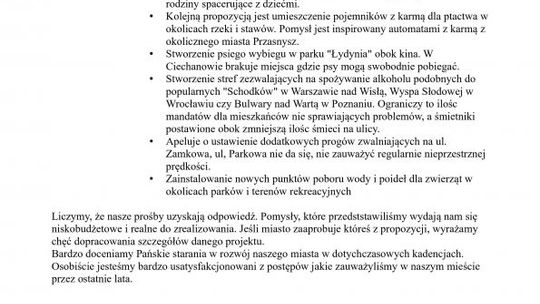 Marcin Rzeczkowski i Jakub Kamieniecki, w liście otwartym do prezydenta Ciechanowa Krzysztofa Kosińskiego proszą o realizację na terenie miasta pomysłów zgłoszonych przez ankietowanych przez nich Ciechanowian (pełna treść listu znajduje się w galerii poniżej). - Po przeprowadzonej ankiecie z mieszkańcami Ciechanowa wybraliśmy najczęściej proponowane/łatwe do zrealizowania sugestie tj. umieszczenie kontenerów na odpady w okolicach "za zamcza", ponieważ jest to miejsce często odwiedzane przez spacerowiczów, przez osoby z psami, osobami robiącymi piknik oraz rodziny spacerujące z dziećmi. Kolejną propozycją jest umieszczenie pojemników z karmą dla ptactwa w okolicach rzeki i stawów. Pomysł jest inspirowany automatami z karmą z okolicznego miasta Przasnysz. Stworzenie psiego wybiegu w parku "Łydynia" obok kina. W Ciechanowie brakuje miejsca gdzie psy mogą swobodnie pobiegać. Stworzenie stref zezwalających na spożywanie alkoholu podobnych do popularnych "Schodków" w Warszawie nad Wisłą, Wyspa Słodowej w Wrocławiu czy Bulwary nad Wartą w Poznaniu. Ograniczy to ilość mandatów dla mieszkańców nie sprawiających problemów, a śmietniki postawione obok zmniejszą ilość śmieci na ulicy. Ustawienie dodatkowych progów zwalniających na ul. Zamkowej i ul. Parkowej. Zainstalowanie nowych punktów poboru wody i poideł dla zwierząt w okolicach parków i terenów rekreacyjnych - piszą w liście panowie Marcin i Jakub.