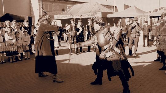 Na jarmarku nie zabrakło także szermierzy, którzy zaprezentowali pokaz fechtunku białą bronią historyczną. Przedstawiciele Ligi Baronów zaprezentowali pojedynek Pana Wołodyjowskiego z Kmicicem prosto z Trylogii Henryka Sienkiewicza. Jeśli chodzi o broń to można było zobaczyć pokaz posługiwania się batem. Umiejętność strzelania z niego zaprezentował Bartosz Gadziomski Blizzard.