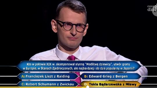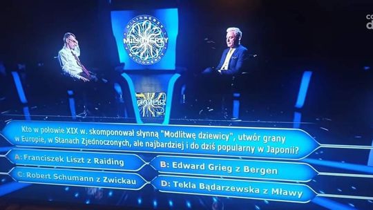 Oczywiście prawidłowa odpowiedź to wariant D: Tekla Bądarzewska z Mławy. Takiej też odpowiedzi udzielił Tomasz Orzechowski z Łodzi i został kolejnym zwycięzca programu „Milionerzy”.