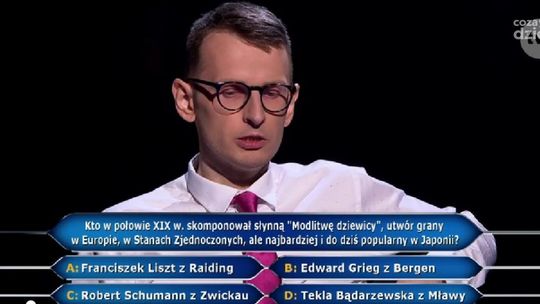 Gracz do wyboru miał cztery warianty odpowiedzi: A: Franciszek Liszt z Raiding, B: Edward Grieg z Bergen, C: Robert Schumann z Zwickau, D: Tekla Bądarzewska z Mławy.