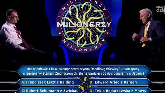 Tomasz Orzechowski z Łodzi dotarł do ostatniego i najważniejszego pytania teleturnieju „Milionerzy”. Tradycyjnie finałowe pytanie odczytała Hubert Urbański, a brzmiało ono następująco: „Kto w połowie XIX w. skomponował słynną „Modlitwę dziewicy”, utwór grany w Europie, Stanach Zjednoczonych, ale najbardziej i do dziś popularny w Japonii?”.