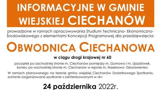 Od 21 października br. udostępnione będą na stronie internetowej: https://obwodnicaciechanowa-dk60.pl/akcja-informacyjna materiały informacyjne wraz z formularzem opinii.