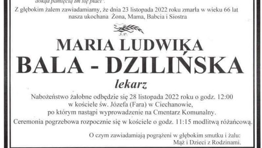 W środę wieczorem (23 listopada) zmarła lekarz Maria Ludwika Bala - Dzilińska, legenda ciechanowskiej kardiologii. Była m.in. zastępcą dyrektora szpitala w Ciechanowie do spraw medycznych oraz koordynatorem (ordynatorem) oddziału kardiologii. Szkoliła przyszłych specjalistów kardiologii. Pracowała w poradniach i prowadziła prywatną praktykę lekarską.
