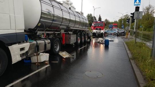 - Po przybyciu na miejsce zdarzenia pierwszego zastępu został stwierdzony wypadek dwóch samochodów: osobowego Renault Clio oraz ciężarowego Daf z naczepą. Samochodami podróżowali sami kierowcy, którzy opuścili pojazdy przed przybyciem straży. Na skutek zdarzenia jedna osoba odniosła niewielkie obrażenia. W samochodzie ciężarowym doszło do rozerwania zbiornika paliwa i wycieku oleju napędowego na jezdnię - relacjonuje mł. kpt. Damian Kołpaczyński z ciechanowskiej straży pożarnej.