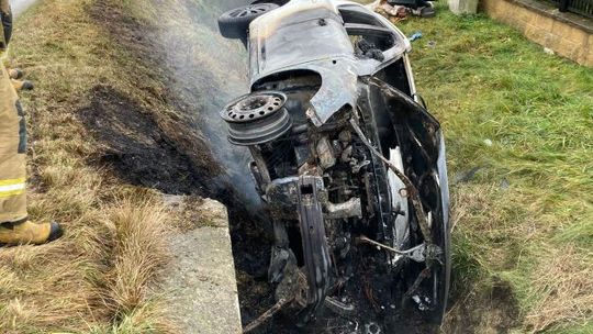 - Po przybyciu na miejsce zdarzenia strażacy zastali samochód osobowy Kia Ceed, który leżał na lewym boku w przydrożnym rowie - całkowicie objęty pożarem. Kierowca samochodu opuścił pojazd samodzielnie przed przybyciem straży pożarnej. Działania zastępów PSP polegały na zabezpieczeniu miejsca zdarzenia i przeprowadzeniu rozpoznania. Podano jeden prąd wody z linii szybkiego natarcia. Ratownicy pracowali w aparatach ochrony układu oddechowego - informuje kpt. Damian Kołpaczyński. Przez godzinę pracowały na miejscu dwa zastępy straży pożarnej.