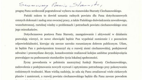 - Dotychczasowa postawa Pana Starosty, zaangażowanie i aktywność w działaniu pozwalają wierzyć, że nowe obowiązki będzie Pan wypełniał sumiennie i z poczuciem odpowiedzialności, kierując się zawsze szeroko rozumianym dobrem publicznym. Ufam, że będzie Pan z poświęceniem troszczył się o rozwój ziemi ciechanowskiej, podejmował odważne i przemyślane decyzje, konsekwentnie realizował kolejne ambitne przedsięwzięcia pozwalające na podnoszenie standardów życia lokalnej społeczności. Życzę powodzenia w pełnieniu zaszczytnej funkcji Starosty Ciechanowskiego, zadowolenia z podejmowania nowych wyzwań i optymizmu potrzebnego przy pokonywaniu codziennych trudności. Mam wielką nadzieję, że uda się Panu zrealizować wiele ciekawych planów i zamierzeń, a rozwój powiatu ciechanowskiego będzie dla Pana zawsze powodem do satysfakcji, dumy i radości - czytamy w liście.