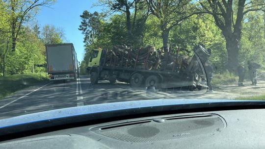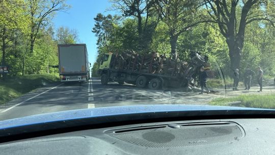 Uwaga kierowcy! Duże utrudnienia na trasie Ciechanów - Płońsk. 500 metrów przed Kraszewem ciężarówka wioząca drewno wjechała do rowu.