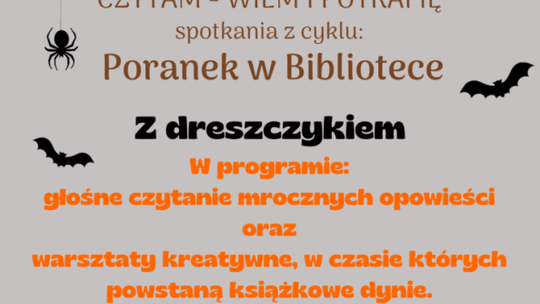 O godzinie 11:00 w Krzywej Hali odbędzie się kolejne spotkanie z cyklu „Poranek w Bibliotece”. Uczestnicy będą mieli okazję posłuchać „strasznych” opowieści i wziąć udział w kreatywnych warsztatach, podczas których powstaną książkowe dynie.