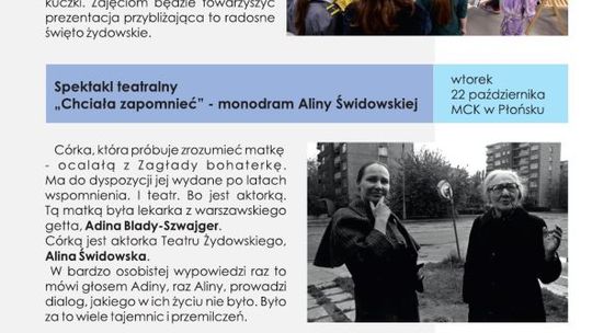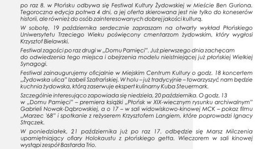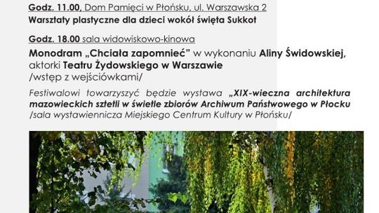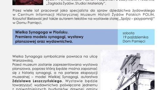 Premiera modelu synagogi, wystawy planszowej oraz wydawnictwa - godz. 14.00 – Dom Pamięci, ul. Warszawska 2. Przed muzeum zostanie zaprezentowana wystawa planszowa, poprzez którą będzie można zapoznać się z historią synagogi, a na parterze ekspozycji muzealnej – model Wielkiej Synagogi, autorstwa Zdzisława Leszczyńskiego. Wystawie będzie towarzyszyć wydawnictwo poświęcone jednemu z najważniejszych budynków dawnej gminy żydowskiej w Płońsku. Synagoga stała na działce położonej przy dawnej ul. Koziej 19, aktualnie ul. Warszawskiej 5. W 1826 roku budynek synagogi strawił pożar. Odbudowano ją jednak w tym samym miejscu jeszcze przed 1830 r. Synagoga została rozebrana w latach 50-tych XX w. ze względu na zły stan techniczny, w jaki popadła po II wojnie światowej. Działka, na której stała nieruchomość, przeszła na rzecz Skarbu Państwa. W pobliżu synagogi stała łaźnia rytualna. Dziś w miejscu tym jest zlokalizowana lokalna siedziba ZUS.