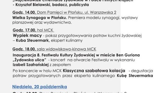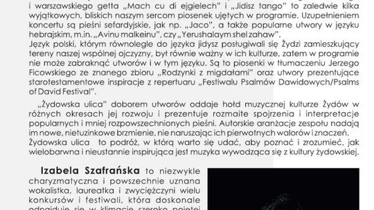 Inauguracja 8. Festiwalu Kultury Żydowskiej w mieście Ben Guriona - sala widowiskowo-kinowa MDK, godz. 18:00. Żydowska ulica – koncert na otwarcie Festiwalu w wykonaniu Izabeli Szafrańskiej z zespołem. „Żydowska ulica” to muzyczna podróż po zakamarkach kultury i muzyki żydowskiej. Podróż, w której elementy folkloru Żydów aszkenazyjskich i Żydów sefardyjskich przeplatają się z obecnie dominującą kulturą Izraela – ojczyzny współczesnych Żydów. Jednakże tradycyjne zapożyczenia z języka hebrajskiego stanowią stały element wszystkich języków żydowskich, w tym jidysz i ladino. Program obejmuje utwory nawiązujące do wielojęzykowej kultury żydowskiej, a szczególnie bliskiemu naszej kulturze języka jidysz, w którym powstała niezliczona ilość tradycyjnych pieśni, szlagierów i poruszających utworów napisanych w okresie II wojny światowej.
