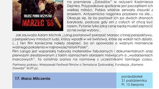 Pokaz filmowy o tematyce żydowskiej w sali widowiskowo-kinowej MDK. O godz. 17:00 rozpocznie się Pokaz filmu ,,Marzec’68” reż. Krzysztof Lang. Przed projekcją odbędzie się spotkanie z reżyserem prowadzone przez Ignacego Strączka, Wicedyrektora Warszawskiego Festiwalu Filmów o Tematyce Żydowskiej.