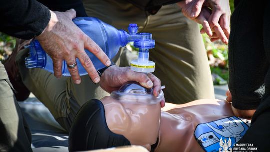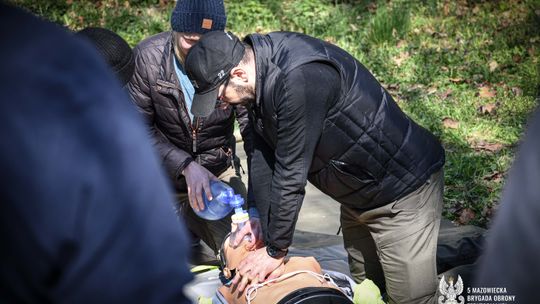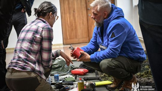 Uczestnicy programu wGotowości podczas zajęć w terenie. Zdjęcia pokazują trening pierwszej pomocy, budowę prostych schronień oraz naukę pakowania ekwipunku ewakuacyjnego pod okiem instruktorów.